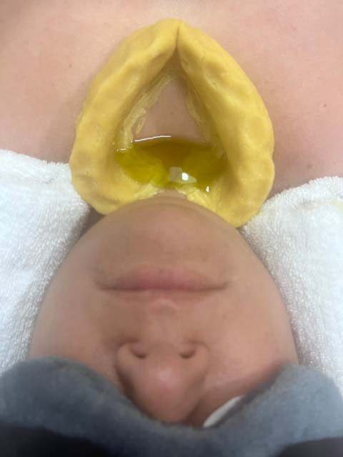 Un delicado hilo de aceite tibio fluye sobre el entrecejo —el “tercer ojo”— induciendo un estado de calma profunda.