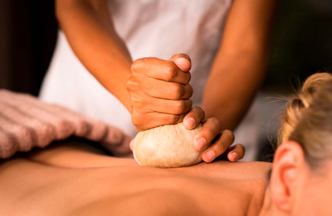 Una combinación terapéutica de masaje y sudoración con pindas (saquitos de hierbas, arroz o plantas medicinales calentadas en aceite).